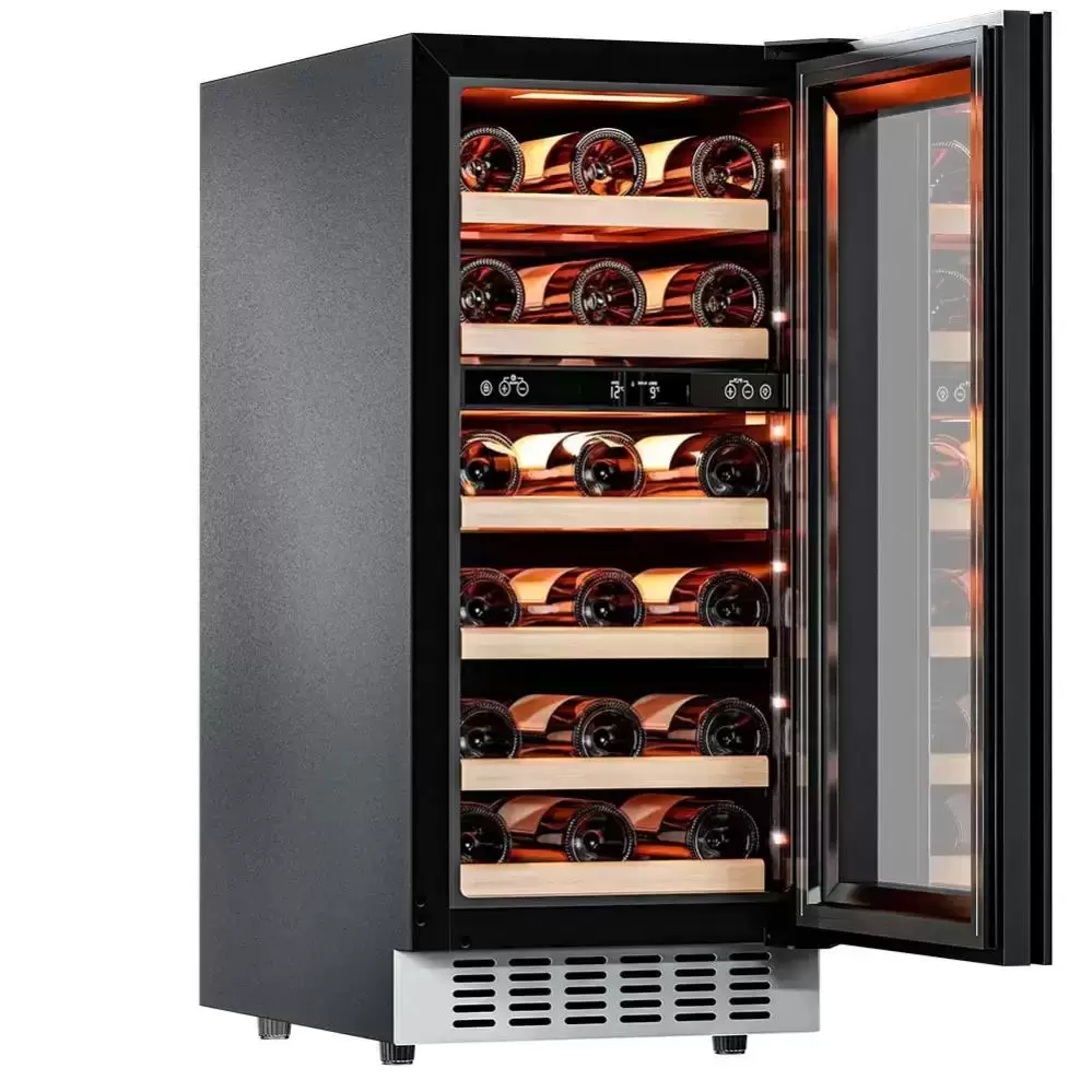 Винный холодильник Meyvel MV28NH-KWT2 имеет две температурные зоны, в которых одновременно можно хранить разные сорта алкоголя и выставлять разные сочетания настроек. Он встраивается в нишу, что удобно, если у вас ограничен метраж помещения. Благодаря компактным размерам данная модель — отличный выбор для офиса, гостиничного номера. Количество бутылок, которое можно разместить с учетом полной комплектации и из расчета объема бутылки 0,75 л, — 28 шт.